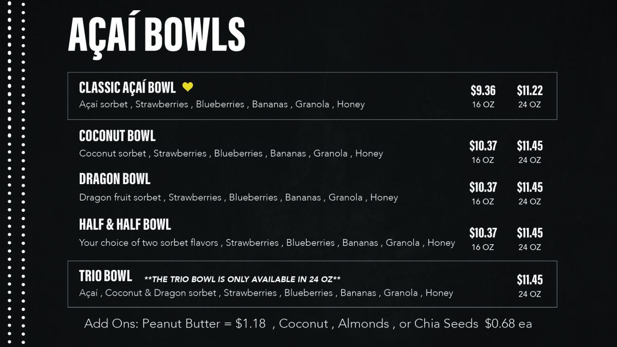 Go ahead and try our acai bowls while you visit, These Acai Bowls are a standout menu item that has gained popularity since being introduced. The bowls are highly packed with antioxidants and flavor. Whenever getting one of these bowls you can expect them to be made with  the highest quality of acai puree and topped with freshest fruits that are locally sourced. They also come with granola and a drizzle of honey on top. They make for a perfect breakfast before work or a snack that’s as nutritious as it is delicious on a hot sunny day.